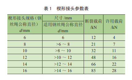 2)應(yīng)考慮相同抗拉強(qiáng)度較小直徑鋼絲繩使用的情況,當(dāng)使用較小直徑鋼絲繩時(shí),選擇較小型號(hào)的楔形接頭會(huì)降低安全系數(shù),甚至無法使用。