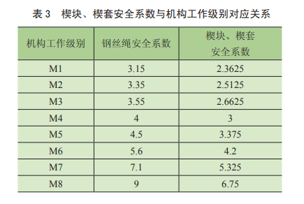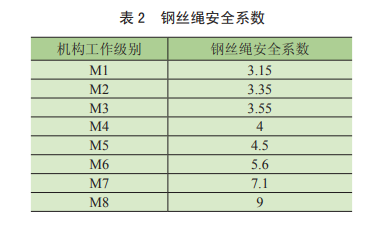 9.4.1.1.6條“用楔塊、楔套連接時(shí),楔套應(yīng)用鋼材制造,連接強(qiáng)度不應(yīng)小于鋼絲繩破斷拉力的75%”、第6.3.2.3.2.2條鋼絲繩選用的最小安全系數(shù)法,運(yùn)動(dòng)繩的安全系數(shù)與機(jī)構(gòu)工作級(jí)別對(duì)應(yīng)關(guān)系見表2。