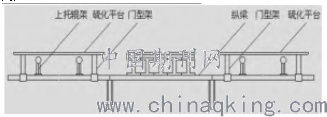 為了提高工作效率,我們專(zhuān)門(mén)加工四個(gè)門(mén)形架,其高度稍高于帶式輸送機(jī)上托輥的高度。硫化前,每?jī)蓚€(gè)門(mén)形架為一組橫跨在上托輥的上方,并在機(jī)架上固定牢固后鋪上平板,兩個(gè)硫化平臺(tái)即搭設(shè)完畢(如圖1所示)。然后在兩個(gè)平臺(tái)之間只需拆除3架上托輥架,鋪設(shè)硫化底梁、水壓板、隔熱板和下加熱板,該工序即可完成。與通常的施工方案相比,可節(jié)約時(shí)間1h。