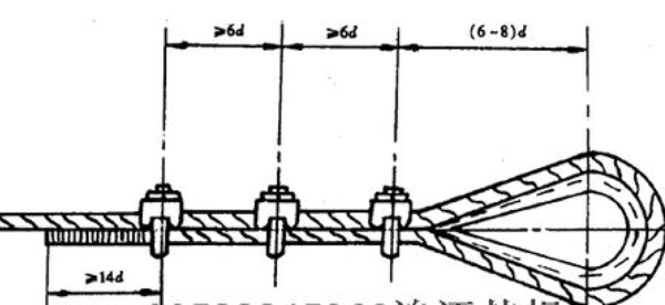 (3)繩卡之間的排列間距一般為鋼絲繩直徑的6~7倍左右,繩卡要一順排列,應(yīng)將U 形環(huán)部分卡在繩頭的一面,壓板放在主繩的一面。