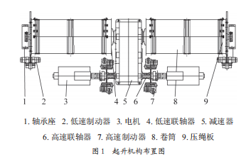 除了以上基本配置,起升機(jī)構(gòu)還配置有可靠的安全保護(hù)裝置,如限位裝置,安裝在卷筒軸承座上,以及鋼絲繩防亂繩裝置,安裝在卷筒底部的防亂繩擋桿。