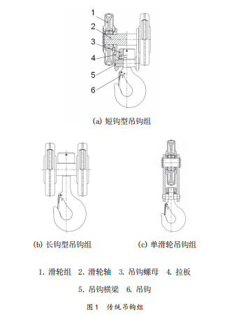 比較常見的傳統(tǒng)吊鉤組主要分為短鉤型和長鉤型兩種,見圖1,圖1a為短鉤型吊鉤組,圖1b為長鉤型吊鉤組,圖1c為單滑輪吊鉤組。其中短鉤型吊鉤組采用標準吊鉤,主要由滑輪罩殼、滑輪組、滑輪軸、拉板、吊鉤螺母、推力軸承、吊鉤橫梁及吊鉤等組成?;喺謿ぶ饕鸬綋趵K及旋轉件保護的功能。吊鉤與吊鉤螺母采用螺紋連接并通過推力軸承支承在吊鉤橫梁上,鉤體可以在水平面內自由轉動。螺紋采用圓柱銷或者防松板防松?;喗M定位并支承在滑輪軸上,通過拉板將滑輪軸與吊鉤橫梁相連并傳遞載荷。該吊鉤組零部件種類較多,吊鉤螺母采用鍛件并且機加工要求高,與吊鉤的連接螺紋防松需要配做,因此互換性差。標準橫梁受尺寸限制因此需要采用鍛件并且對材料要求較高。但該形式吊鉤組使用較普遍,因此價格具有一定的優(yōu)勢,不過也很難形成自己的品牌特色,而且整體高度尺寸較大。另一種長鉤型吊鉤組,采用特殊的長柄吊鉤,鉤柄直接支撐在滑輪軸上。因此具有較少的零部件數(shù)量及較小的整體高度。但是這種設計僅適用于滑輪數(shù)目為偶數(shù)的小倍率滑輪組。另外該設計需要使用非標長柄吊鉤,沒有普通吊鉤的批量化優(yōu)勢,因此生產(chǎn)成本較高。且吊鉤組整體重心位置較高,不利于防止吊鉤組空載偏斜。