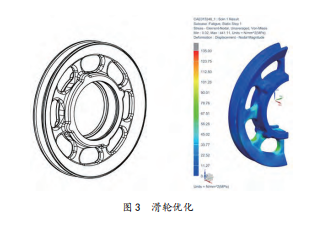 1)滑輪優(yōu)化通過有限元的方法對滑輪進行計算,優(yōu)化受力結構,在滿足承載能力的前提下盡量減輕其自重。減少滑輪自重不僅能降低生產(chǎn)成本還有助于降低吊鉤組整體重心位置改善空鉤使用性能。詳見圖3。