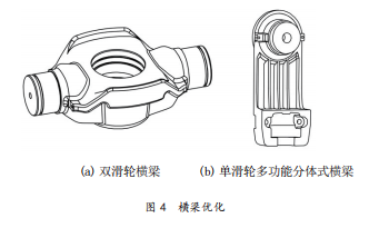 2)橫梁優(yōu)化不拘泥于傳統(tǒng)橫梁標準,采用新的材料新的制造方法及結構進行設計。優(yōu)化其受力分布減少應力集中,簡化生產(chǎn)工藝。增加操作抓手功能,提供指定的抓握位置使操作更合理,避免由于操作部位及方法不當對設備及操作人員安全造成損害。下沉式設計降低橫梁重心。見圖4。