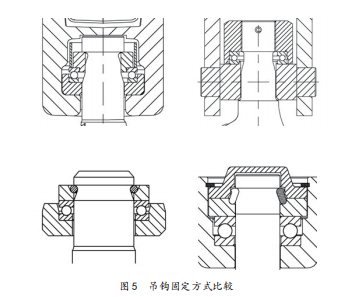 3)吊鉤固定方式優(yōu)化螺紋固定工藝復雜應力集中程度高,防松還需要配做。因此在設計新吊鉤組時,為找到一種更經(jīng)濟可靠的固定方式,研究并計算了多種方法,最終通過多次討論及有限元分析,找出最優(yōu)化的方案。新吊鉤采用卡塊固定。分體式卡塊加工方便,安裝及拆卸簡單,工作可靠。通過壽命試驗,證明其完全能滿足公司相關要求及國家相關標準的規(guī)定。