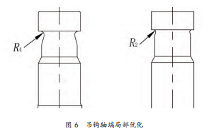 4)吊鉤軸端局部應力優(yōu)化局部應力的大小會在很大程度上影響疲勞壽命,而局部的形狀及尺寸會很大程度的影響局部應力的大小和分布。吊鉤軸端部應力集中部位的優(yōu)化可以有效的提高其疲勞壽命,因此對此處進行了多次有限元分析以得到最優(yōu)的局部設計參數(shù)。