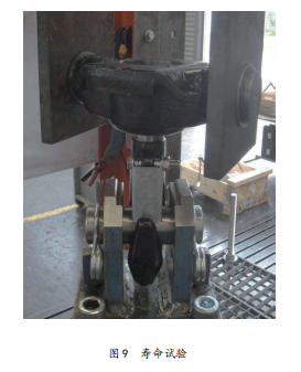 所有零部件的材料、尺寸公差、機加工及裝配都必須滿足圖紙的要求。所有零部件必須經(jīng)過檢驗合格后方可用于試驗。此處的試驗是指壽命試驗,吊鉤及吊鉤組其它試驗應按相關國家規(guī)定進行,此處不做贅述。本試驗采用液壓疲勞試驗機,通過試驗工裝固定并加載,詳見圖9。載荷為0.01倍額定載荷到1.3倍額定載荷,試驗頻率2.5Hz。經(jīng)試驗驗證,該形式吊鉤組完全滿足公司標準及相關國家規(guī)定的要求。