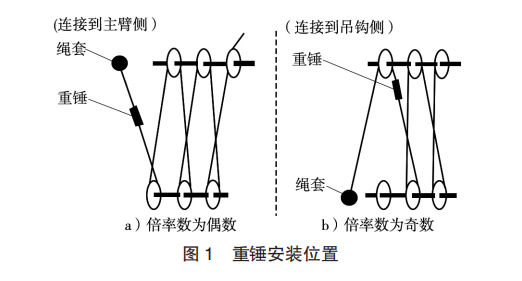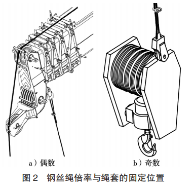 鋼絲繩末端繩套的安裝位置,也根據(jù)倍率數(shù)的奇偶而變化(圖2)。