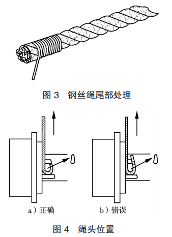 (1)新更換鋼絲繩時,應(yīng)對鋼絲繩的兩端進(jìn)行處理(圖3),以防止切斷處引起鋼絲繩的松散,同時繩頭不應(yīng)漏在卷筒外面(圖4)。