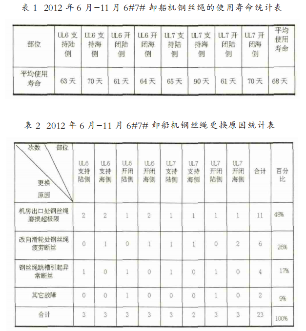 從表1可以看出,2012年6月-11月,6#7#卸船機鋼絲繩的平均使用壽命統(tǒng)計在68天,超過該港口的控制要求。