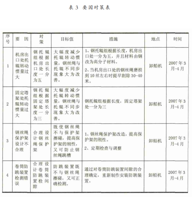 卸船機承擔著鐵礦石接卸的任務,該設備運轉的效果直接影響公司的接卸能力。國內某港口6#7#振華卸船機自2006年6月投入使用以來,起升開閉鋼絲繩的使用壽命只有1-2個月,鋼絲繩更換頻繁,維修工作量大,運行成本高,設備故障率高,其故障率高低直接影響到卸船機的生產效率。基于上述原因,該港口提出要把6#7#振華卸船機起升開閉鋼絲繩的平均使用壽命由原來的68天提高至85天的技術改造目標。