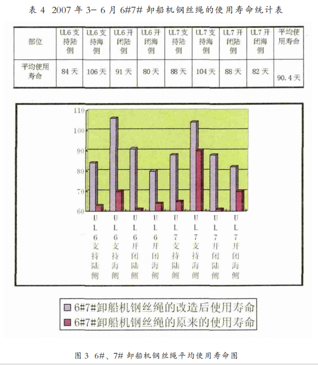 從上述圖表可以看出,經過技術改造后,6#7#卸船機鋼絲繩平均使用壽命改造已達到并超過了預定目標。