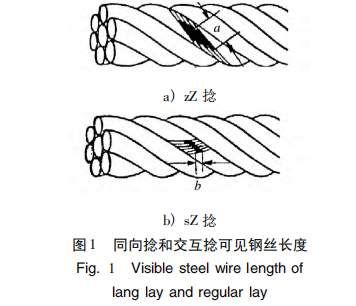 對同向捻鋼絲繩,3根相鄰股之中間股單根鋼絲可視長度要比交互捻大,所對應(yīng)的鋼絲繩長度也長,單根鋼絲如果想獲得相同頻次的可視部位,同向捻需要的鋼絲繩長度要大,換言之,對固定長度同向捻鋼絲繩,單根鋼絲被重復(fù)可視的頻次要比交互捻少,因此,標(biāo)準(zhǔn)規(guī)定同向捻工作機構(gòu)級別相同時鋼絲繩最多斷絲數(shù)比交互捻要少是正確的。