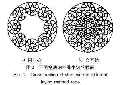 1問題提出 鋼絲繩捻法通常有交互捻、同向捻和混合捻,其中交互捻應(yīng)用最多,混合捻應(yīng)用最少,同向捻應(yīng)用居中。雖然同向捻應(yīng)用不如交互捻普及,但除受結(jié)構(gòu)限制鋼絲繩必須為同向