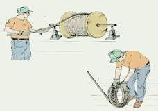 2 整卷鋼絲繩使用時(shí)如需要截?cái)?,?yīng)在截?cái)嗲皩⒔財(cái)嗖课粌蓚?cè)鋼絲繩用鐵絲綁扎牢固,尤其對于多層股抗旋轉(zhuǎn)鋼絲繩,有條件的情況下可將鋼絲繩熔斷。