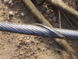 旋挖鉆機(jī)鋼絲繩割斷時(shí),請?jiān)阡摻z繩的割斷處兩邊用鐵絲扎緊,防止鋼絲繩松散,散股,造成鋼絲繩局部斷絲斷股