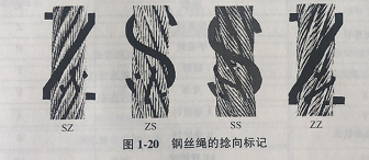 在一次捻鋼絲繩中,是指外層鋼絲沿鋼絲繩軸線的捻制方向;在二次捻鋼絲繩中,是指外層股沿鋼絲繩軸線的捻制方向;在三次捻鋼絲繩中,是指子繩沿鋼絲繩軸線的捻制方向。鋼絲繩的捻向也分左捻(S)和右捻(Z)。鋼絲繩的捻向標(biāo)記如圖1-20所示。