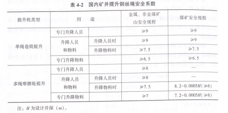 選擇與確定安全系數(shù),其目的是為了使鋼絲繩具有足夠的最初強(qiáng)度,來(lái)保證在一定時(shí)間內(nèi)能安全運(yùn)行,而在換繩時(shí)尚有一定的剩余強(qiáng)度,以免發(fā)生斷繩事故。在使用過(guò)程中由于受許多因素的影響,如各種應(yīng)力(拉伸、彎曲、扭轉(zhuǎn)、動(dòng)載)的作用、表面磨損及內(nèi)部斷絲等,使鋼絲繩的有效強(qiáng)度逐漸減小。因此,要準(zhǔn)確地計(jì)算安全系數(shù)是困難的。而目前應(yīng)用最廣泛的是根據(jù)安全規(guī)程來(lái)選擇安全系數(shù)。“麥全規(guī)程規(guī)定的安全系數(shù)是一個(gè)標(biāo)定值,不能真實(shí)反映鋼絲組的實(shí)際安全是度。含夜收裝明經(jīng)過(guò)實(shí)踐證明在該安全系數(shù)條件下,在一定時(shí)間內(nèi)的絲健能安金做了明確規(guī)定。我國(guó)在《金屬、非金屬礦山安全規(guī)程》和《煤礦安全規(guī)程》中,對(duì)礦井提升鋼絲繩安全系數(shù)的規(guī)定見(jiàn)表4-2。