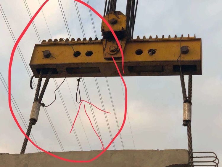 此掛繩方法1:邊上2條鋼絲繩不用取掉,吊帶松兩邊卸扣即可,又能保證吊具平行及防止吊具旋轉(zhuǎn)90度導致鋼絲繩斜交叉作業(yè)。 此掛繩方法2:將吊梁鋼絲繩左右環(huán)加都上小鋼絲繩,吊梁到