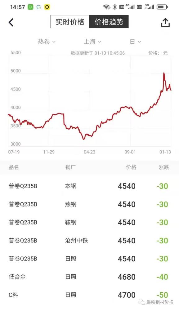 據(jù)找鋼網(wǎng)跟蹤,13日國內(nèi)建筑鋼材價格下跌10-50,其中杭州中天報4350,跌50;北京河鋼報4040,跌30;廣州廣鋼報4620,跌40。國內(nèi)熱軋板卷價格下跌20-60,其中上海本鋼報4540,跌30;唐山安豐報4360,穩(wěn);佛山柳鋼報4520,跌30。國內(nèi)中厚板價格跌20-120,其中江陰長達(dá)報4560,跌30。國內(nèi)冷軋板卷價格跌40-70,其中上海本鋼報5470,跌50。